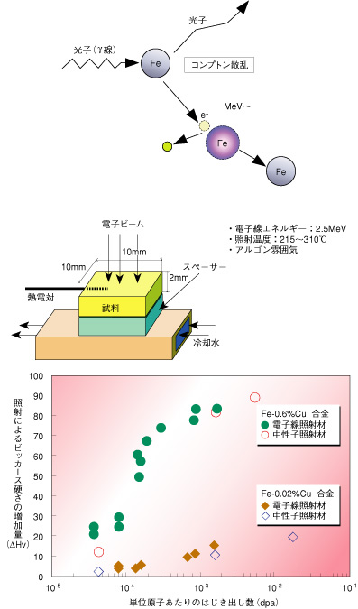 | 原子炉圧力容器を構成する鋼材は、供用期間中に炉心からの中性子が当たることにより、ナノメートル(nm)オーダーの小さな照射欠陥クラスターが数多くできて硬くなります。硬くなる程度が大きいと、容器の健全性に影響を与えることになるため、中性子照射を受けるとどの程度硬くなるかを高精度に予測できることが大事です。 これまで照射硬化の予測では、照射量として1 MeV以上の高速中性子がどれだけ当たったかを考え、ガンマ線の寄与は考慮されておりません。実際、原子炉でのガンマ線による原子のはじき出し損傷量(dpa)を計算すると、高速中性子の高々数パーセントにすぎません。ところが、dpaで数%であっても、ガンマ線によるはじき出しは、主にコンプトン電子によって生じるため、はじき出しの機構から考えると、高速中性子に比べより効率よく照射欠陥クラスターを生成する可能性が考えられます。そこで、実験的にガンマ線の寄与を検討するために、モデル合金を用い、ガンマ線照射を模擬した電子線照射と、材料試験炉での中性子照射を行い、照射硬化の程度を検討しました。 図1-6 は2種類のFe-Cu合金に電子線と中性子を照射し、照射後の硬化量を、dpaを基準に比較したものです。合金双方について、電子線照射と中性子照射による硬化量がほぼ一致しており、照射硬化はdpaを基準として評価してよいこと、すなわち、ガンマ線の硬さへの寄与は中性子の高々数%であることが明らかになりました。 |