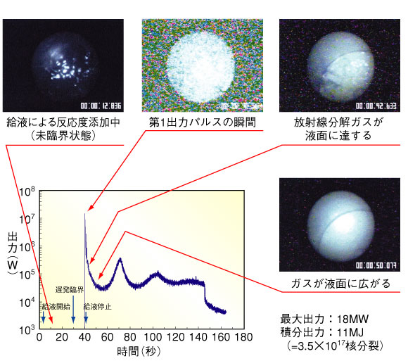 第1出力パルスの瞬間(非常に強い放射線のため耐放射線光ファイバースコープが発光)。