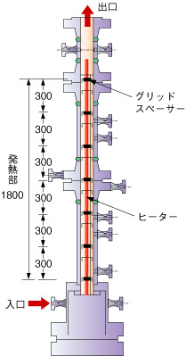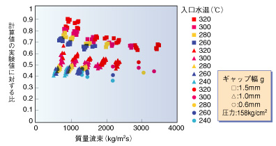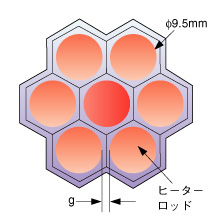 | 原研では、ウラン資源を有効利用できる低減速スペクトル炉の設計研究を行っています。この原子炉では、中性子のエネルギーを低下させずに核分裂を起こさせます。そのために、燃料棒の間隔を狭くして冷却を行う水の体積を減らしています。このような原子炉の成立性を評価する際に、冷却性能の評価が重要になります。ところが、現在炉心設計で必要とされている燃料棒間隔の狭い状態での除熱性能を評価するためのデータベースが十分ではありません。 そこで、炉心を模擬したテスト部を製作して、実際の原子炉(PWR)と同じ流動条件でどの程度除熱が可能かを測定する実験を実施しました。テスト部の断面を図2-1および図2-2に示します。流路内に燃料棒を模擬する電気ヒータを7本設置し、それらの間隙を1 mm前後で変更して実験を行いました。実験パラメータは、原子炉と同じ圧力で、流量や流体温度を変更しました。実験で得られたデータを、現在設計に用いられている解析コードと比較することにより、解析コードが実際の除熱性能をどの程度に評価するかを示したのが図2-3です。ここに示されているように、解析コードは実験データより小さい除熱しかできないという結果を与えるため、この解析コードで計算すれば十分に安全側の設計ができることがわかりました。今後、低減速BWR条件下でのデータを取得する計画です。 |