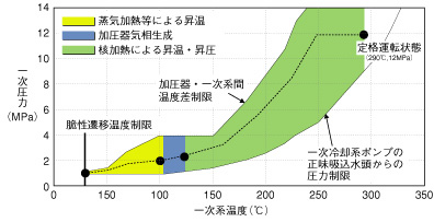 原子力船の研究開発用エンジニアリングシミュレータは、我が国最初の原子力船「むつ」用に開発され、実験航海の事前評価、運転制御特性の把握、運転員の訓練・ヒューマンマシン研究等に利用されました。その後、将来の原子力船の動力源として、軽量・コンパクトで受動的安全性の高い原子炉の設計開発が進められ、出力100 MWtの一体型炉の工学設計が完了しています。この船舶用一体型炉プラントの運転性能の確認や高度な自動制御系の開発のために一体型炉用シミュレータを開発しました。一体型炉では蒸気発生器および一次系をほぼ原子炉容器内に内装し、バルブ、ポンプの数をきわめて少なくしています。このためにシミュレータでは、新たに貫流型熱交換器、受動的安全系、水張り式格納容器等を模擬しました。図2-6は一体型炉シミュレータの監視・操作用画面を示しています。また、図2-7はシミュレータによって確立することのできた起動・停止運転方式を示しています。シミュレータによって得られた結果は受動的安全系実験装置、事故解析用コード等による結果と概ね一致することが確認されました。