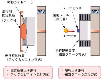 RPVのISIは放射線下で行われるため、作業員の被ばく低減の観点から遠隔自動装置が導入されています。沸騰水型原子炉の自動UT装置は、RPV周囲にあらかじめ設置されている固定軌道をUT装置が走行する方法を採用しています。また、超音波探触子は3チャンネルで構成されており、同じ溶接線に対して複数回の探傷を必要としていました。