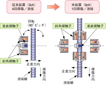 HTTRでは、設備の合理化と探傷時間の短縮可能なUT装置を開発しました。この装置は磁気クローラでRPV表面に吸着して走行するもので、走行用の固定軌道は不要となります。また、多チャンネルの探触子を一体保持しているため1回の探傷で済むようになりました。