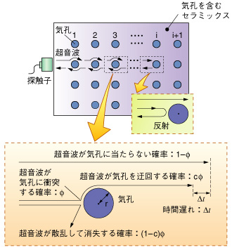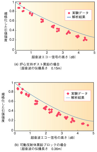 | 高温ガス冷却炉などのように、黒鉛材料を多量に使用する原子炉では黒鉛構造物の強度が使用時間の経過とともにいろいろな原因で変化していきます。酸化などで、密度が減少していく場合は強度が低下します。このような状況を破壊試験ではなく、非破壊的に評価する方法の開発が切望されていました。ところが、実際には今まで超音波特性などから非破壊的に黒鉛構造物の強度を定量的に評価することは困難とされていました。図2-13のモデルに示すように、気孔を含むセラミックスに超音波が侵入すると、超音波は気孔を迂回したり気孔で散乱されたりして、透過の場合超音波の強度が減衰し、反射の場合強度が増加することになります。一方、気孔の大きさの増加および気孔の数の増加に伴ってセラミックス材料の強度が低下することがよく知られています。この研究に基づき、図2-14に示しているように、気孔を含む黒鉛中の超音波の減衰および気孔による反射波エコーの高さの増加と黒鉛材料の強度を結びつけるモデルを提案し、超音波エコーの反射波の増加減衰を測定することによって、黒鉛構造物の強度を推定評価することが可能になりました。図2-14(a)はHTTRの炉心支持ポスト黒鉛の超音波パルスエコー高さと引張強度の減少率との関係を示しており、パルスエコー高さが増加するにつれて強度が減少していく様子がわかります。図2-14(b)は同様な現象を可動反射体黒鉛ブロックについて示しています。 |