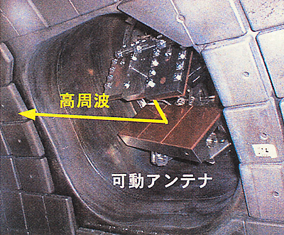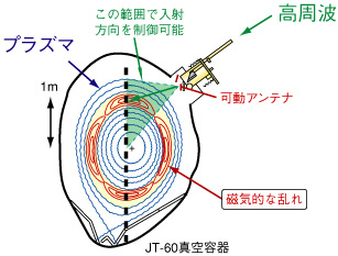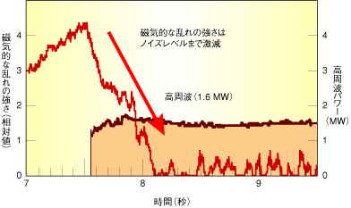 | 100 GHz帯ジャイロトロン(大電流電磁波発信管)は、原研が世界に先駆けて、170 GHzで1 MWの発信に成功する等、その開発が大きく進展しています。ジャイロトロンが発する電磁波を、磁気的な乱れが発生しているプラズマ内部に局所的に入射させることによって、この磁気的な乱れを抑え安定性を回復できることを実証するのが本研究の目的です。JT-60では、可動アンテナを用いて高周波(110 GHz)を当該領域に精度良く入射できるシステム(図3-4, 図3-5)の開発を進めてきました。 図3-6に実験結果の一例を示します。この例は、JT-60のプラズマに、時間約7.5秒のタイミングで電子サイクロトロン高周波(EC)のパワー(1.6 MW)が入射されています。 時間が7.5秒以前には、磁気的な乱れがプラズマ内部に発生していることが磁気プローブで検出されています。電子サイクロトロン高周波の入射方向を調整してECパワーを注入すると集中的に流れるプラズマ電流によってプラズマ内部の磁気的な乱れが抑制され、時間8秒以後乱れの強さをノイズレベルまで減少させることができました(図3-6)。 JT-60で実証した、電子サイクロトロン高周波による磁気的な乱れの抑制法は、ITERにおいても適用できるものであり、今後、さらに研究を深めてまいります。 |