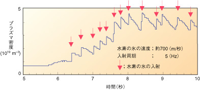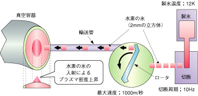 | 核融合炉の燃料をプラズマに注入する方法の一つに、水素の氷を高速で入射する方式があります。原研では、これまで、空気銃と同じ原理を用いて、200気圧の水素ガスで水素の氷を発射させ、秒速2,300 mを達成しました。しかし、空気銃方式では、連続発射ができません。これを克服するために、遠心力を用いた加速方式が世界で開発されてきました。原研では、ドイツのマックスプランク・プラズマ物理研究所の協力を得て、遠心力方式の開発を行ってきました。 原理図を図3-10に示します。重水素ガスを12 Kの温度まで冷やして棒状の氷を作り、それを所定の長さに切って、高速で回転しているローターの中心に落とします。落下した氷は、ローターに切られた溝にそって加速され、ローターの端部から発射されて、輸送管を通ってプラズマに入射されます。 開発に当って直面した課題は、氷の蒸発ガスによる悪影響でありました。氷表面の蒸発により発生した水素ガスが、製氷部の温度を上昇させ、また後発の氷の軌道を乱します。氷がプラズマまで届かなかったり、2個の氷が重なって同時に入射された場合がありました。 これを解決するために、製氷部と加速部を真空遮断して、製氷部の温度上昇を防ぐとともに、各所にガス抜きの格子状窓を設けました。さらに、輸送管の接続部に傾斜を設け、また回転ローターの溝に屋根を設けるなどの考案を行い、氷の動きを安定させました。 その結果、2 mmの立方体の大きさをもつ重水素の氷を、秒速700 mで、1秒間に5発の割合でJT-60のプラズマに入射することに成功しました。入射時間は最大10秒です。その一例を図3-11に示します。プラズマの密度が、氷の入射に同期して階段状に上昇していることがわかります。 実際の核融合炉に用いるためには、氷の大きさや入射周期の安定化など、さらなる性能向上が必要ですが、技術的に十分な見通しを立てることができました。 |
