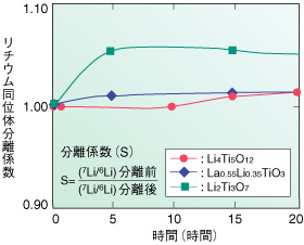 | 核融合炉燃料のトリチウム生産を効率的に行うためには、ブランケット内の6Liの濃度を高くする必要があります。これまで、水銀アマルガム法が、リチウム同位体分離方法に用いられていましたが、水銀による環境汚染などのため、新たなリチウム分離法の開発が望まれています。このため、Liイオン伝導体中で同位体質量の違いによる移動速度の差を利用した同位体分離法(図3-20)を考案し、実証しました。 イオン伝導体として、Liイオン導電率が高いLi2O-TiO2系のスピネル型Li4Ti5O12、ペロブスカイト型La0.55Li0.35TiO3、ラムズデライト型Li2Ti3O7の3種類を選定しました。これら3種類のLiイオン伝導率は10-7〜10-1 S/cm(室温〜800℃)であり、十分な伝導率を有することを明らかにしました(図3-21)。これらのLiイオン伝導体を用いたリチウム同位体分離効率の測定結果は、スピネル型で1.014、ペロブスカイト型で1.010、ラムズデライト型で1.058であり、水銀アマルガム法のリチウム同位体分離係数(1.02〜1.07)と比較して遜色のない値が得られました(図3-22)。実用化に向けた技術開発を進める予定です。 |