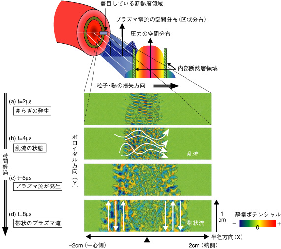 プラズマ帯状流は、静電ポテンシャルの等高線に沿って粒子・熱の損失方向に直角に流れ(図(d))、粒子・熱の損失を抑えます。