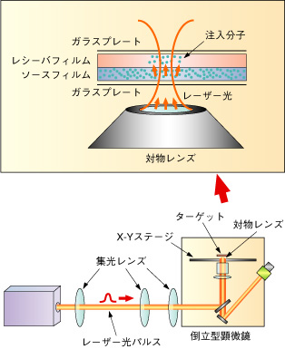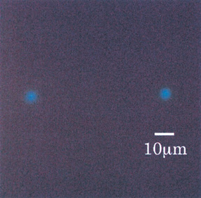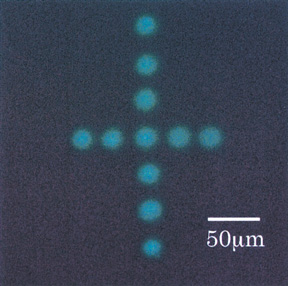 | 次世代デバイスとして注目されている有機分子素子の作製には、機能性有機分子を高分子フィルムの任意の位置にミクロン・ナノサイズで配置する技術の確立が必要不可欠であり、そのためのレーザー分子注入法の基礎研究を進めています。この方法は、機能性有機分子を分散させた高分子フィルムに強いレーザー光パルスを照射すると、高分子フィルムで爆発的にエッチングが起こり、有機分子が飛び出して別の物質に注入される「アブレーション転写」という現象を利用しています。 実際には、注入させたい機能性有機分子を含む高分子フィルム(ソースフィルム)と、何も含まない高分子フィルム(レシーバーフィルム)を重ね合わせてターゲットとし、そこに倒立型顕微鏡とパルスレーザーを組み合わせて作った装置を使って、レーザー光をミクロンサイズ以下に絞って照射します(図4-8)。 さらにこの分子注入装置にミクロン精度で位置制御可能なX-Yステージを組み込み、その上にターゲットを乗せてステージ位置を外部から制御しながら分子注入すれば、高分子フィルムに任意の有機分子注入スポットパターンを描くことができるはずです。 図4-9は、クマリン545という蛍光色素を使って高分子フィルムに描いたミクロンサイズの十字架です。さらに照射パルスレーザー強度やターゲット構造の最適化を行うことによって、最小直径4 μmの微小スポット領域に蛍光色素を注入することに成功しました(図4-10)。 この技術は、例えば有機エレクトロルミネセンス(EL)物質を使ったディスプレイなど、幅広い応用が期待できるでしょう。 |