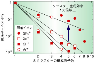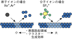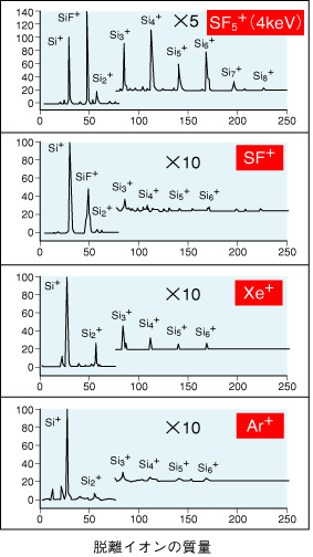 | クラスターは数個から数百個の原子が集まってできた、直径“数ナノメートル”程度の粒子です。同じ原子が集まったものでもこのくらいの大きさになると、導電性や発光特性など、様々な物性が通常の“バルク物質”とは異なってきます。これまで、クラスターは主にレーザーや電子ビームをターゲットに照射して作られてきました。これに対し、イオンビームを使えばイオンとターゲットとの反応を利用して、バルク物質では得られない組成のクラスターを作ることができます。しかし、クラスターの生成効率が悪く、十分な量を得るためには非常に高い輝度のビームが必要でした。私たちは、SF5+のように少し大きな分子イオンをSiに照射することにより、他のイオンに比べて顕著なクラスター生成を見い出しました(図6-11)。この結果、1 µA/cm2程度のビームでもこれまでの100倍以上の効率でクラスターを取り出すことに成功しました(図6-12)。大型の分子イオンが固体表面に衝突すると、表面の励起領域は図6-13のように原子イオンの場合より大きく広がります。この結果、原子の脱離が促進されクラスターの生成効率が高くなったものと考えます。Siの他, C, B, Beなど種々のターゲットでも、顕著なクラスター生成を観測しました。さらに、C6F5+など炭素を含む分子イオンをSiに照射すると、Si-Cのような二元系クラスターを生成できることもわかりました。多元系クラスターや同位体クラスターのように、全く新しい物性を持つと予想されるナノスケールの素材作製にも道が拓けると期待しています。 |
