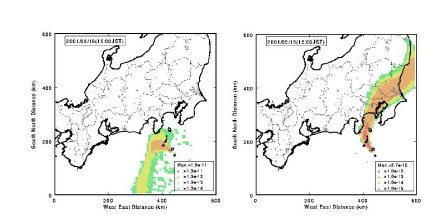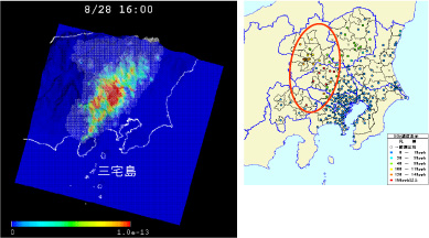 2000年8月28日午後の関東西部の異臭騒ぎについて、SPEEDIを利用したシミュレーションによりその原因を解明しました。同日未明に三宅島で噴出した火山ガスは、午前中は安定した南風に乗って関東西部の上空に達しました。日中になって気温が上昇し大気混合層が発達したため、火山ガスの1部は内陸部に降下しました。そのため関東西部の人々が異臭を感じ、環境庁の監視システムは高濃度の二酸化イオウを検出したわけです。図7-1に示すように、シミュレーションと監視システムの検出値はよく一致しています。噴出した火山ガス中の二酸化イオウは毎時約2,500トンでした。