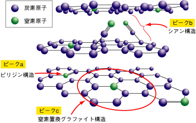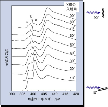 | ダイヤモンドよりも硬い物質や原子1個分の厚さしかない半導体、このような夢の材料を実現するものとして、炭素と窒素の化合物(窒化炭素)は大きな注目を集めています。世界中の研究者が競ってその合成に取り組んでいますが、これまでどんなものが実際にできるのかよくわかりませんでした。その主な原因は、合成したものの中には様々な局所構造がばらばらに含まれているため、構造が揃った結晶を調べる従来のやり方では、限界があったからです。放射光は、このような構造を調べるのに大きな力を発揮しました。放射光の大きな特徴であるエネルギー可変性は、物質中に含まれる特定の元素だけのX線吸収スペクトル(NEXAFS)を調べることを可能にします。NEXAFSはX線を吸収した部位の局所構造に応じて変化しますから、窒化炭素中の窒素のNEXAFSにより、窒素原子周囲の局所構造について調べることができます。さらに、放射光の偏光特性を用いた入射角によるNEXAFSの変化(偏光依存性)から、局所構造の向きを調べることが可能になります(図8-5)。 これらの特徴により、私たちは、窒素分子イオンを注入したグラファイト中に、窒素置換型のグラファイト構造が存在することを明らかにしました(図8-6)。このグラファイト構造の窒化炭素は理論的に半導体的な電子特性を持つことが予測されており、新しい半導体材料として注目を集めています。 |
