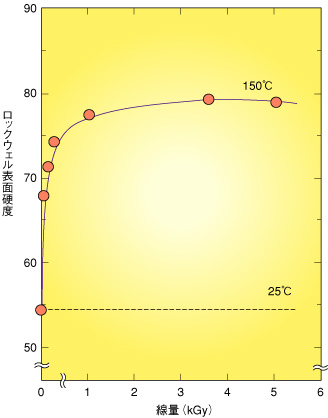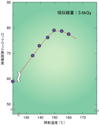 | ポリカーボネート(PC)や芳香族ポリスルホン(PSF)は歯車やポンプなどに用いられるエンジニアリングプラスチックと呼ばれる工業用高分子です。表面硬度が増すと、特殊な機械部品への応用や人工医療デバイスへの適用が可能になります。照射温度を変化させると、照射効果が大きく変わることがこれまでの原研の研究で明らかにされています。PCとPSFの硬さを改良する目的でγ線と電子線照射における照射温度(室温〜230℃)の効果を検討しました。 図9-3に示すように、PCを150℃でγ線照射するとロックウエル表面硬度が5 kGyまでの低線量域で増大しました。硬度増大が最大になる線量を調べると図9-4のようになり、PCのガラス転移温度と同等の150℃でした。また、高温でγ線照射すると耐摩耗性が30%改善されます。PSFの場合も、3〜4 kGy照射で著しく硬度が大きくなり、ガラス転移温度(178℃)付近の照射で最も硬度が高くなることがわかりました。照射時間がγ線に比べ大幅に短縮できる電子線照射の場合も図9-3、9-4と同じ結果が得られます。これらの高分子は照射により架橋より切断が優先的に起きていることがわかりました。適当に主鎖が切断されることにより、分子鎖の絡み合いが解け、かつ主鎖が自由に運動できるガラス転移温度付近の照射のため、分子のパッキング状態がより密になり、その結果、硬度や耐摩耗性が高くなったと解釈されます。 これまで、高分子の硬度を高めるのにはセラミックパウダーやガラスの短繊維を混入する方法が行われています。放射線を用いた高温照射材料による硬度の制御や耐摩耗性の向上は高分子本来の特徴を損なうことなく改善できる点で、新しい高分子の改質法といえます。 |