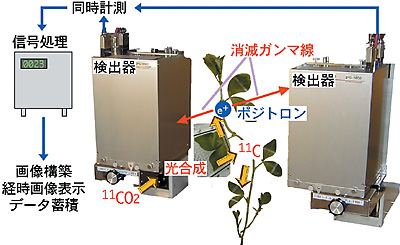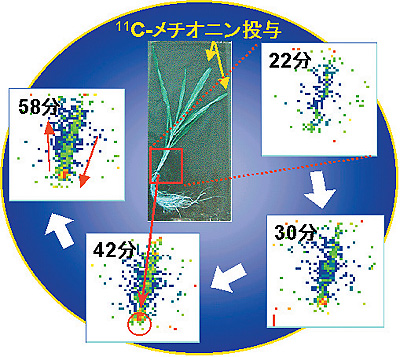 | 植物は、環境に適応して生き抜くために、その変化を感じ取り、体内の様々な代謝機能を調節したり、場合によっては個体の形状を変化させて、環境への適応を図っています。植物の生き残り戦略を知るためには、従来、極めて困難だった生きた植物中での物質の移動を経時的に捕らえる計測技術の開発が不可欠と考え、脳の代謝機能を調べるために利用されているポジトロン(陽電子)断層画像技術を発展させ、植物の代謝機能研究のためのポジトロンイメージング法という新しい計測法を開発しました(図9-10)。ポジトロン放出核種で標識した化合物の分布を、2.3 mmの空間分解能を持つ植物研究用ポジトロンイメージング装置で二次元画像として捕らえ、画像構築のために必要な放射能量、情報量とも医学分野でのイメージングに比べ低く、S/N比の高い計測を可能としました。さらに、計測に使用する検出器の面積を14×21.5 cmまで拡大するとともに、計数回路、演算処理回路など信号処理に関わる性能を向上させることにより、これまでの計測手法では見ることができなかった、生きた植物が取り込んだ物質が代謝され、その産物が違う組織へと送り出される様子や、吸収した栄養成分の分布変化が、5秒という極めて短時間ごとの連続画像として得ることに成功し、植物内での物質移行がこれまでいわれていたようなゆっくりとしたものではなく、数秒から数分という短い時間で起こる現象であることを明らかにしました。土壌中の鉄を吸収するためにオオムギが根から分泌する物質の前駆物質は植物体内に広く存在するため、これまで植物内のどこで合成されているのか謎でした。私たちが開発した植物研究用ポジトロンイメージング装置を用いて、生きた植物内でのアミノ酸の移動の様子を世界で初めて捕らえることに成功し、合成の場が根であることを突き止めることができました(図9-11)。 環境を制御した植物中で生じている物質移行の変化から、環境の変化に対する植物の応答機構が少しずつわかってきています。 |