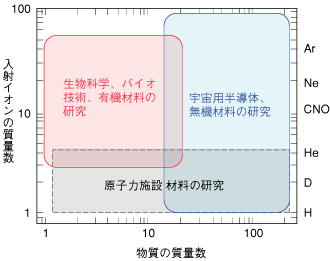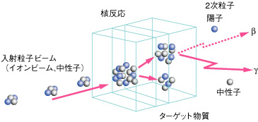 | 近年における加速器技術の進歩によって、イオンビームや中性子など、これまでとは異なる種類で、かつ、エネルギーの高い放射線が容易に発生できるようになり、その利用研究は材料・生物科学、バイオ技術、中性子科学など幅広い分野で進展しつつあります。しかし、エネルギーが非常に高いイオンや中性子が物質にあたると、図9-12に示すように、原子核反応によって物質中に放射能が生成するため、照射した試料や加速器施設についての適切な放射線安全管理が必要となります。また、生成放射能は加速粒子の種類やエネルギー、物質の種類および実験条件により異なるので、安全で効率的な利用実験を行うためには、生成する核種や放射能に関する情報を利用者が実験の計画段階から容易に得られることが必要です。 従来は利用者が原子核分野の専門家であり、ターゲット物質も限定されていたので上記の必要性はありませんでしたが、近年になって多数の非専門家が極めて広い範囲の物質を対象にこうした照射実験を試みるようになったので、難しい専門的知識なしで簡便に扱える計算システムが不可欠となってきました。 このたび世界に先駆けて開発されたIRACコードでは、イオンや中性子の入射粒子、およびターゲット物質に関わる条件のみを入力するだけで、数MeVから数百MeVのエネルギー範囲にあるイオンビームによる生成放射能を簡単に計算できます(図9-13)。利用が広がりつつあっても実測データが非常に少ない重イオンについては特に大きな威力を発揮しています。 本計算コードはイオン照射研究施設TIARAにおける申請課題の審査等の開かれた利用運営、実験計画、施設の安全管理等にこれまで活用され、多大な実績をあげるともに、国内外の加速器コミュニティで広い研究分野に利用されています(図9-14)。 |