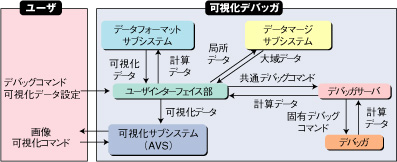 私たちはこのような課題を解決するために大規模シミュレーションに不可欠な並列計算用のデバッガ(「並列デバッガ」)と「可視化プログラム」を結合させて新しい機能を盛り込んだ「可視化デバッガ」を開発しました(図10-4)。可視化デバッガと呼ばれるものは今までも有りましたが、これらは行列やベクトルの成分の数値がどのような分布をしているか表示するものでした。