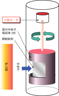 | 国際熱核融合実験炉(ITER)に取り付けられるブランケットテストモジュールは中性子やγ線にさらされます。またITERはパルスモード運転が行われます。 ブランケットテストモジュールの開発の一環として、一部を模擬した照射試験が材料試験炉(JMTR)で計画されており、キャプセルの開発が現在進められています(図12-1)。ITERのパルスモード運転を模擬するため、キャプセルには窓付きの中性子吸収体を回転させたり、任意の位置で停止させたりできる小型サーボモータが必要となります(図12-1)。モータは炉心の上端から1メートルほど上にあるキャプセルの上部に取り付けられますが、中性子やγ線にさらされるため耐放射線性を有することが必要であり、かつ小型にするためモータ巻線は細径でなければなりません。 既存の小型サーボモータとして、巻き線にポリエステル銅線を使用したものがありますが、耐放射線性の点で今回の照射試験には使用できません。そこでモータ巻き線にポリイミド銅線を使うなど、全体で44種類のモータ構成部品の内21種類の部品(表12-1) に耐放射線性の優れた材料を使うなどの改善を施したモータを試作しました。 試作したモータをキャプセルに組み込み(図12-2)、JMTRで照射試験を行い、耐放射線性などを調べました。その結果、本モータはγ線でも既存品の30倍程の照射量に耐え、JMTRでの照射試験に十分使用可能なことが確認されました。 なお、本モータは、照射試料の回転や縦方向移動など多様な照射試験を可能にします。 |