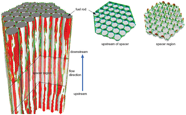 Predicted vapor flow around fuel rods In a tight-lattice core of an innovative nuclear reactor, vapor around fuel rods flows from upstream to downstream like a chimney, as shown in red. |