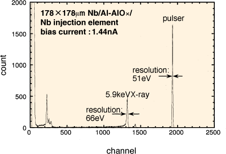 element composed of two superconductors separated by a thin insulator. The theoretical limit of the resolution of the semiconductor detector is about 100 eV. Statistical fluctuations limit the resolution of the STJ detector, so we cannot attain several thousandths of this value as the resolution of the STJ, but it is theoretically expected that a resolution of several tenths of the above value (less than several eV) can be attained. We designed and constructed an STJ detector, optimizing the choice of amplifier and the operating conditions so that it had low voltage noise. The best energy resolution obtained with this system was 66 eV, using a Nb-based STJ detector system (the former best value was 88 eV) (Fig. 1-6). Because this resolution is still poor compared to the theoretical resolution, we are making efforts to produce a better system by studying the x-ray detecting characteristics and the proportionality between the output value from the detector and the radiation energy. |