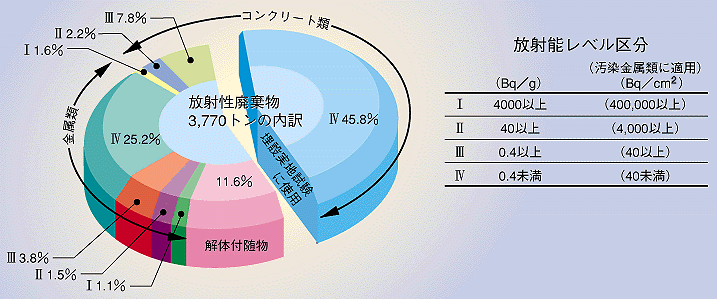 | 動力試験炉(JPDR)解体の成功を支えた大きな要因の一つに、廃棄物の合理的処分技術があげられます。 諸外国の原子炉施設解体では、大量に発生する様々な解体物をある放射能レベルで放射性廃棄物と一般廃棄物に区分しています。わが国では、このような放射能レベルによる廃棄物の区分は許されず、人工放射性核種が検出されたものはすべて放射性廃棄物として処理しなければなりません。 JPDRの解体では、こまめに精密な放射能計測を行い、廃棄物を細かく分類しました。この結果、放射性廃棄物が全解体廃棄物24,440トンのうちの3,770トン(約15%)と、諸外国のプロジェクトと比較して大きな割合を占めました。しかし、このうちの1,670トンは、放射能レベルの非常に低いコンクリート廃棄物でした。この部分は合成樹脂製の袋に梱包し、産業廃棄物と類似の簡易な方法で、東海研究所のサイト内での埋設実施試験に供しました。この方法は、放射性廃棄物を鋼製容器に入れ画一的に管理する従来方式とちがい、その特質に沿って適切に管理するための、将来を見込んだ合理的対処法なのです。埋設試験は、事前のサイトの特長の把握と綿密な安全評価、輸送・埋設作業時の汚染拡大防止策等、周到な計画の基に進められました。 この試験で確認された作業の安全性や方法の合理性、今後更に蓄積される安全性の実績は、現在検討中の「放射性廃棄物の規制除外数値基準」の参考になるばかりでなく、関心を持つ関係者の信頼醸成にも寄与すると期待されます。 |